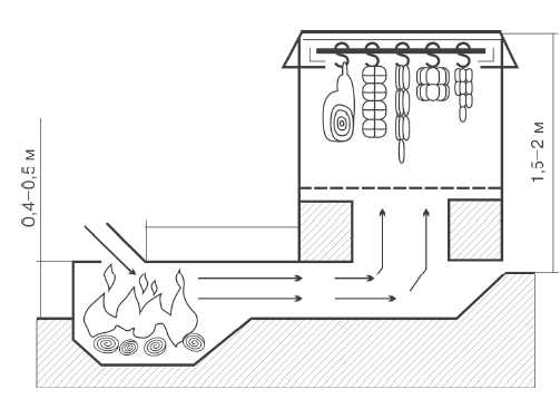 При постройке коптилки холодного копчения своими руками следует размещать очаг в стороне от камеры, в которой будет коптиться мясо.