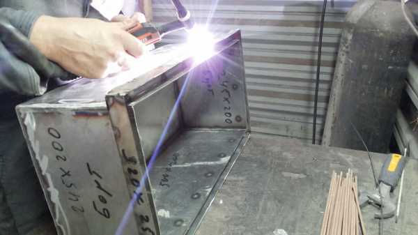 Сначала сваривают задние части коптильного шкафа, а уже потом — передние. Внизу ящика привариваются специальные направляющие для ёмкости с опилками. Для них можно использовать трубу-квадрат размером 5 см на 2 см. После этого приваривают лицевую сторону коптильни с вырезом под ящик. Эта схема коптильни предусматривает ящик размером 38 см на 34 см. Передняя часть с ручкой должна иметь длину на 10 см больше длины ящика, чтобы плотно приставать к шкафу коптильни и не давать дыму рассеиваться в стороны. В нижней части ящика для опилок необходимо просверлить небольшие дырочки для того, чтобы улучшить тягу.