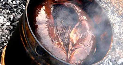 Самодельная коптильня представляет собой ёмкость, объём которой вы можете сделать практически любым. Самое главное, чтобы в него поместилась решётка для укладки рыбы. Её можно выполнить из металлических прутов, соединив их с помощью сварки. Ниже стоит расположить специальный поддон, ведь с коптящегося мяса или рыбы может начать капать жир и попасть на угли, а это снизит вкусовые характеристики конечного продукта. И самое главное, без чего не сможет обойтись коптильня, — это зона для размещения древесного материала, располагаемая в самом низу ёмкости. Как правило, для этого используют различные породы древесины, а в идеальном варианте — можжевельник.