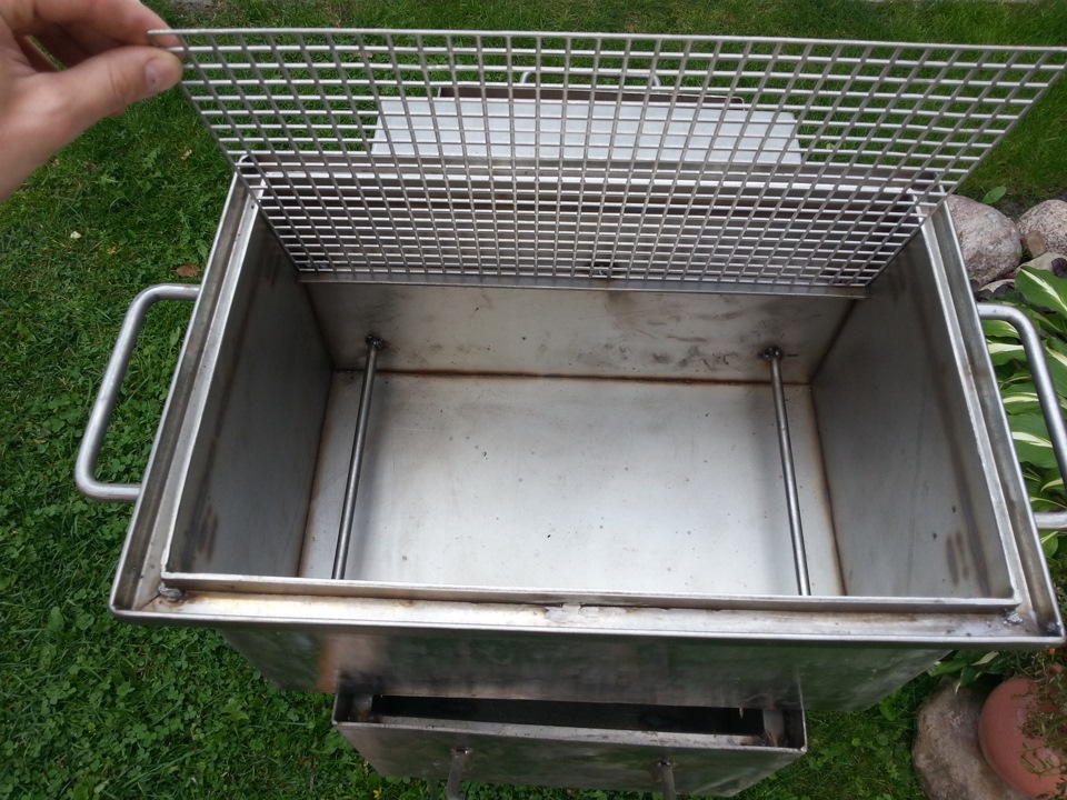 (Вид на коптильню сделанную своими руками сверху. Внизу видны направляющие для ящика, по бокам ребра жесткости стенок.)