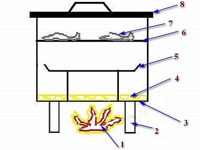 Когда коптильня помещается над огнём, его задача нагреть опилки, которые находятся в самом низу. Они начинают обугливаться и выделять дым, который и придаёт такой аромат продуктам.