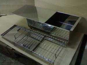 Изнутри, на двух противоположных сторонах короба, от верхнего края необходимо прорезать несколько вертикальных пазов длиной в 5-10 см друг против друга так, чтобы в них можно было вставлять стальные прутья с нанизанной на них рыбой или как вариант, решетку, на которую раскладывают рыбу или другие продукты. Еще один способ – приварить к внутренним стенкам уголки, на которые можно положить прутья или решетку. Внизу короба следует установить съемный поддон из тонкой стали, куда во время копчения будет стекать жир.