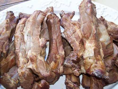 Реберные части нарубить на ломти весом около 500 г. Желательно, чтобы мясо между ребрами было в пропорции один к одному. Куски мяса очистить от пленок, выдерживать на холоде в рассоле два-три дня.