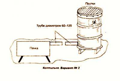 - Устраивается дымоход с протяжённостью 1,2 или 1,5 м, далее строительство топки. Для него подойдёт металлический ящик или кирпичный короб. Топка подсоединяется к дымоходу.