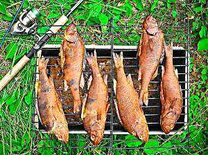 - На решетку помещают мясо, рыбу и прочее. Плотно закрывают крышку и кастрюлю-коптильню помещают над огнем. Через короткое время копченые продукты будут готовы.