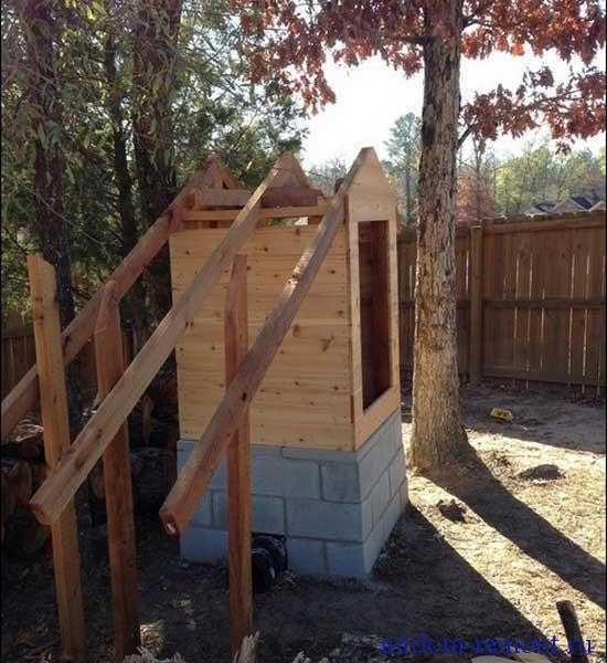 Обшиваем досками каркас деревянной части коптильной и оборудуем крышу. Фото