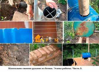 Если Вы не представляете, как выглядят такие устройства, тогда посмотрите на фото коптильни своими руками, а также этапов ее создания, и Вы поймете принцип ее работы. Для копчения большой рыбы подойдет бочка без днища. Чтобы ее установить, нужно выкопать яму диаметром не менее 50-ти см и к ней подвести канаву для выхода дыма. Устанавливается она на кирпичный фундамент и чтобы избежать испарения тепла, нужно замазать щели глиной между фундаментом и самой бочкой. При копчении на таком самодельном устройстве, нужно закрывать листами железа или шифером яму и дымоход.
