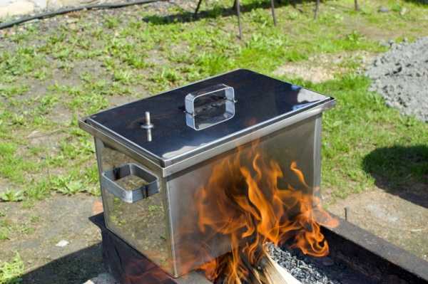 Такая конструкция отличается незначительным весом и транспортабельностью. Не составит труда взять коптильню с собой на пикник, в поход, на дачу, на рыбалку, в дальнюю поездку. Термическая обработка начнется после того, как металлический ящик помещается на костер или мангал.