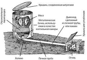 Итак, в первую очередь нам необходимо построить дымоход. Выкопать шахту под него можно разными способами, но мы выбираем самый простой и надежный. Во-первых, нам необходимо будет выкопать ров шириной в 30 см и глубиной в 50-60 см. Можно и глубже, но это очень мучительно, ведь копать узкий и глубокий ров достаточно сложно. Длина рва должна составлять не менее полутора метров от места расположения костра до места установки коптильни. Далее, в ров мы закладываем трубу диаметром примерно в 15-20 см, и проводим ее от костра до входа в коптильню. В некоторых случаях дымоход бетонируют, укладывают асбестоцементные трубы, делают шахту деревянной, но мы считаем, что практичнее всего будет уложить трубу, сварить ее или просто скрепить в месте изгиба и вывести в сооружение. Быстро, очень надежно и долговечно.
