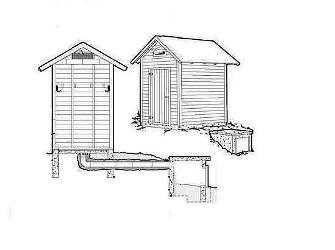 - После чего сооружается деревянное строение высотой 150 или 100 см. Делается каркас из брусков. Между брусками надо проложить поперечины для большей прочности. Затем осуществляется обшивка досками. Одна сторона оставляется под двери.