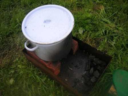 Чтобы добиться большей герметизации, рекомендуется поверх крышки накинуть толстое одеяло. На дно укладывается древесная стружка из фруктовых деревьев. Слой должен составлять несколько сантиметров. Затем емкость устанавливается на блоки и разжигается костер. Время приготовления в среднем составляет 120 минут.
