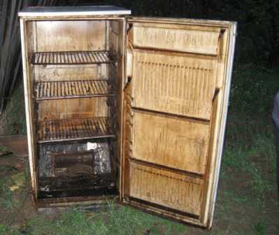 Подобный старый холодильник можно отыскать где угодно. Большинство дачников применяют их для шкафов. Это отличный способ для изготовления коптилки. Идея подразумевает минимальные затраты времени: достаточно извлечь все детали изнутри и оставить только короб с дверью.