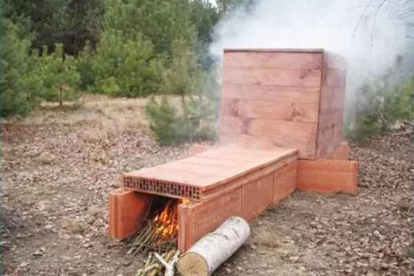 Использование дерева для такой коптильни совершенно безопасно, так как топка отделена от рабочей камеры расстоянием в несколько метров. Наиболее трудоемкая часть работы — подготовка местности, так как желательно создать перепад высот между топочной камерой и непосредственно коптильней.