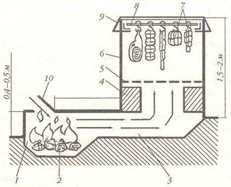Схема стационарной коптильни с топочной камерой и дымоходом в основании