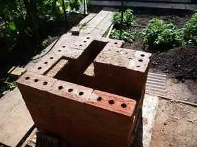 После высыпания на дно материалов, выкладывают ряд фрагментов с применением глиняной смеси. Важное условие качественной кладки — два кирпича встык, находящиеся по длине дымохода. Дымоход должен быть на углу от топки на 8—9 градусов. Кирпич устанавливается на ребро, с перевязкой швов. Высота стенок — не менее 25 см. Перекрытие возводится из кирпича, в форме домика.