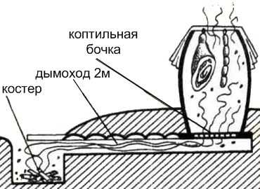 От места, где будет располагаться бочка-коптильня до места, где будет находиться очаг, нужно разметить место под траншею для устройства дымохода. Затем нужно выкопать углубление под импровизированную печку и траншею под дымоход. При выполнении этих работ необходимо учитывать тот факт, что для создания в коптильне хорошей тяги, нужно создать в устройстве такой наклон трубы, чтобы дно коптильной камеры и противень печки с расположенными на нем коптящими опилками, оказались на одном уровне (согласно закону сообщающихся сосудов).