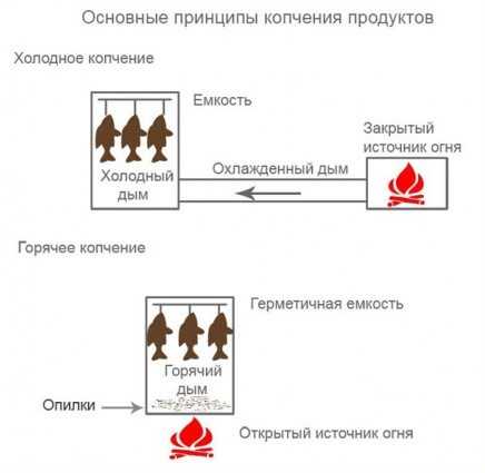 Холодное копчение продуктов происходит при температуре +18−220С. При горячем копчении температура газов достигает +350С и выше. Производится оно на большом огне.