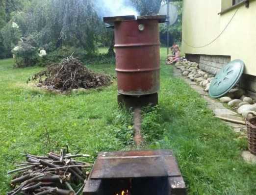 Используя железную бочку, можно при желании не делать даже специального топливника и дымохода. При этом бочку можно поставить на кирпичи, на ее дно уложить стружки и опилки лиственных деревьев и, поддерживая огонь под бочкой, таким образом закоптить необходимые продукты.