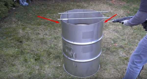 - Отступив от верха бочки примерно четверть ее длины, сделать крепления для решетки, куда будут укладываться продукты.