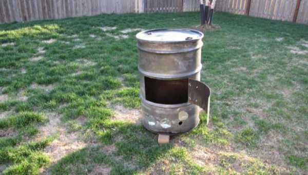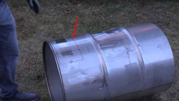 - В нижней части вертикальной бочки сделать дверцу – вырезать квадратный фрагмент и закрепить его на петли. Выполнить задвижку, края отверстия при необходимости закрепить полоской железа.