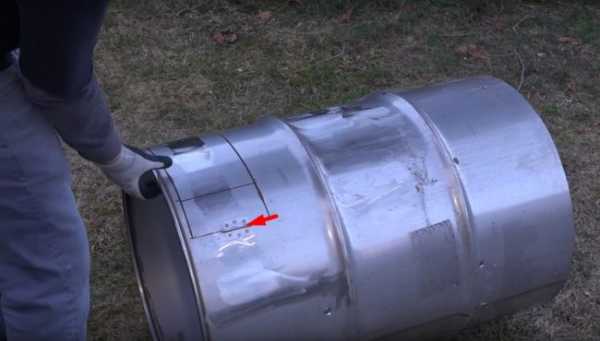 С нижней части бочки он сделал разметку под дверцу.