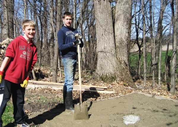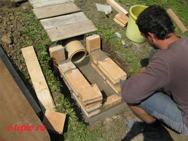 3. Яму для топки заливают цементом, чтобы получился надежный пол. Такое ровное основание необходимо, чтобы сложенная из кирпича топочная камера не стала впоследствии разрушаться при естественных подвижках почвы.