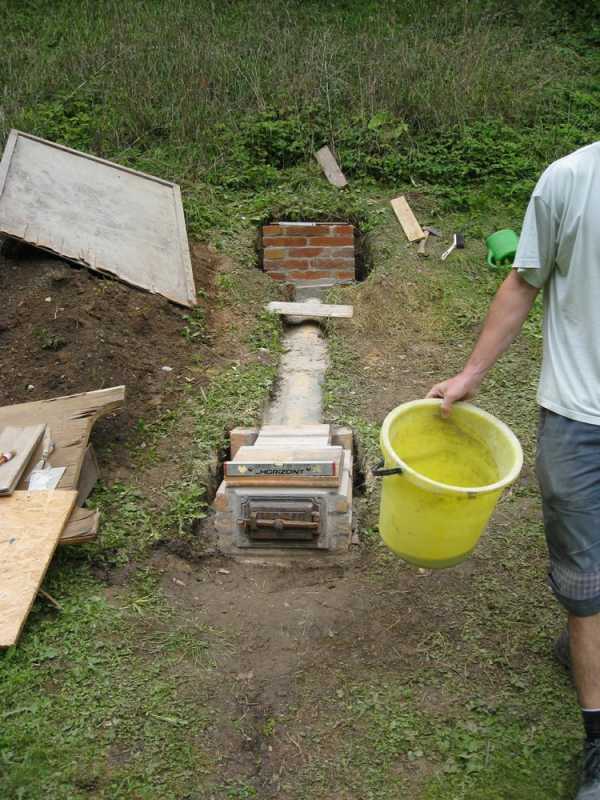 8. Траншею с дымоходной трубой засыпают землей и тщательно утрамбовывают. Земля нужна для лучшего охлаждения трубы и дыма. Влажная земля лучше проводит тепло, чем воздух.