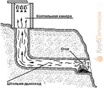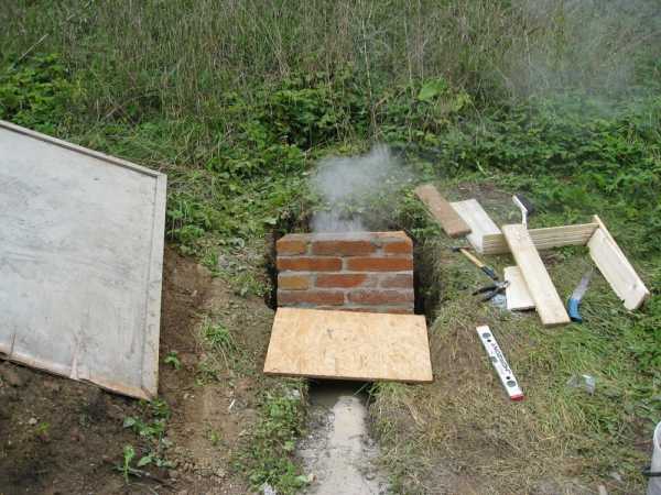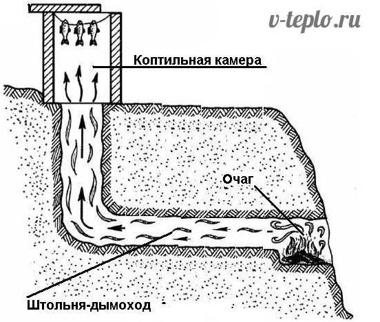 2. Яму для коптильной камеры выкапывают на два или три штыка лопаты глубиной. При попадании в нее дым слегка задерживается. В это время из него выпадают крупные частички сажи, т.е. дым очищается. После этого он поднимается в коптильную камеру.