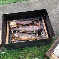 - Коптильня из нержавеющей стали. Несложное приспособление, которое удобно использовать в походных условиях. Металлический короб, внутри которого привариваются решетки на расстоянии, как и в ведре. Конструкция устанавливается на костер или мангал, а сверху накрывается крышкой или листом железа. За 15-25 минут из такой коптильни можно получить аппетитную рыбу, мясо, курицу и т. д.