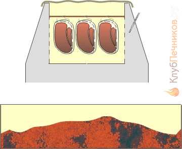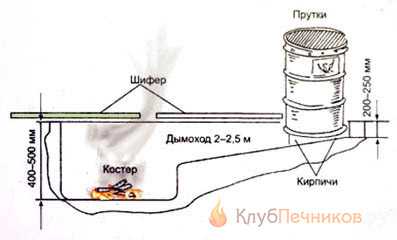 - Выкопать траншею, а сверху прикрыть листовым железом. Чтобы дым не выходил наружу, сверху листы железа присыпают грунтом.