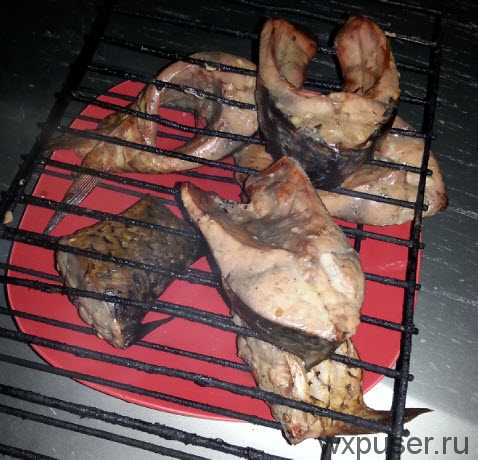 Периодически следует заглядывать под крышку и наблюдать за состоянием рыбы и мяса.