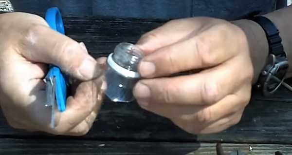 - Приклейте «ниппель» к бутылке 5 L, проденьте веревку и завяжите снизу узел.