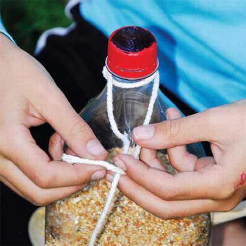 Заполните бутылку птичьим кормом. Заверните колпачок.