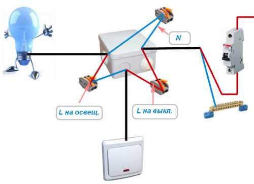 В случае, когда проводка идет на светильник с одноклавишным выключателем (как изображено на рисунке), провод, который отходит от выключателя, соединить с фазой, идущей на светильник (на рисунке L на освещение), а фазу, приходящую на выключатель, соединитьсо всеми фазными проводами (на схеме Lна выключатель). Должно быть 4 соединения.