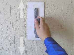 Круговые движения создадут круговой рисунок, движения под наклоном – косой «дождик», движения сверху вниз – «дождик».При растирании штукатурки вы почувствуете, как камешки трутся о стену и создают текстуру. Постарайтесь создавать ровный рисунок, без наплывов.