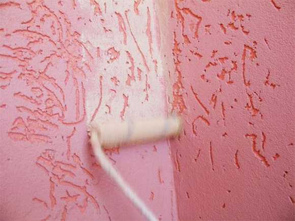 2. После нанесения основного цвета и его высыхания, берете жесткий валик с очень коротким ворсом, после нанесения на него краски, тщательно выкатайте его на вспомогательной поверхности, а затем без нажима наносите новый колер только на верхушки штукатурного слоя.