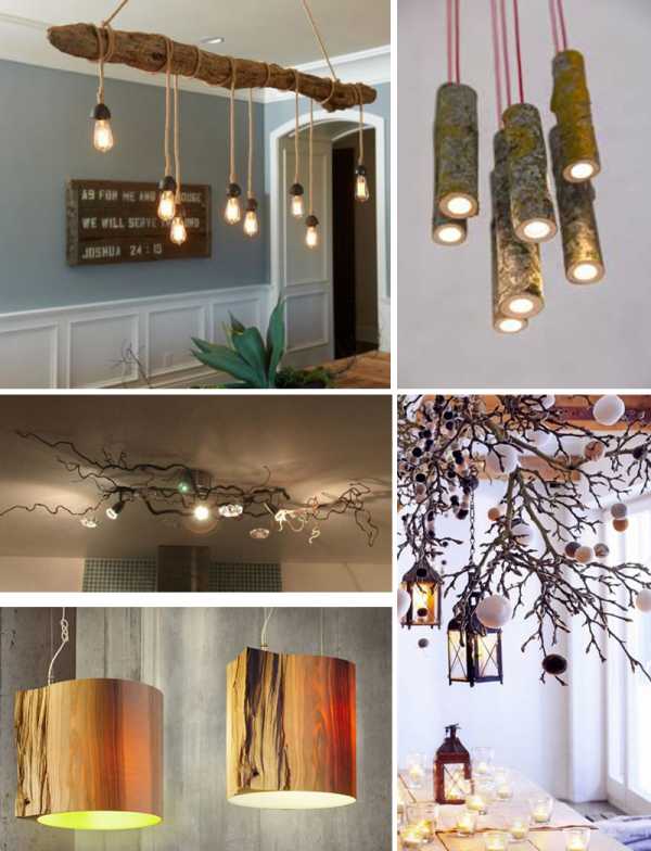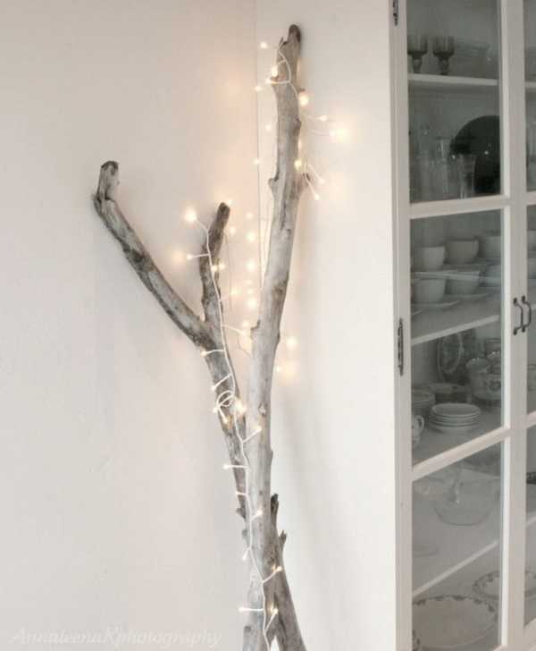 С помощью веток можно создать просто удивительные конструкции. Например, вот этот потолочный светильник из бревна, на который намотаны шнуры с лампочками.