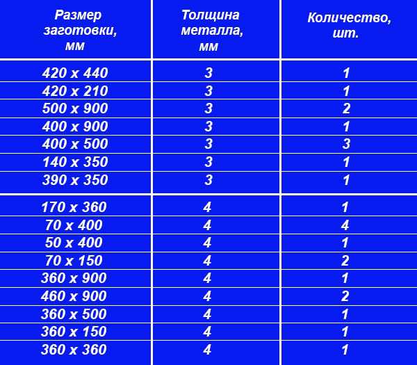 Чтобы собственноручно сделать установку, потребуется сталь Ст 20. Выполненная из нее установке прослужит не менее 15 лет. При большем количестве углерода в стали, материал может прикаливаться от высоких температур, потому для изготовления он не подходит. Если есть возможность, купить можно жаропрочную сталь, легированную молибденом или хромом. Из таблицы можно узнать, какие размеры заготовок потребуются для изготовления устройства.
