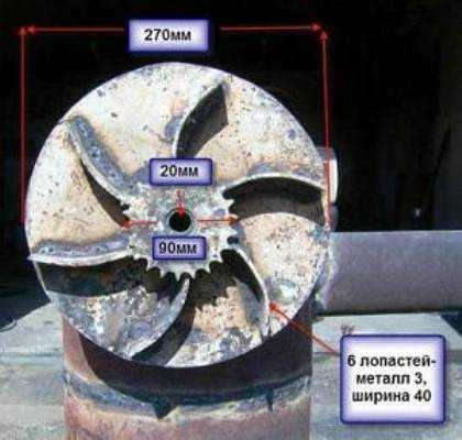 - Снизу на «блин» навариваются швеллеры или уголки, расположенные в виде лопастей. При подходящей толщине лопастей, иногда используется крыльчатка от вентилятора.