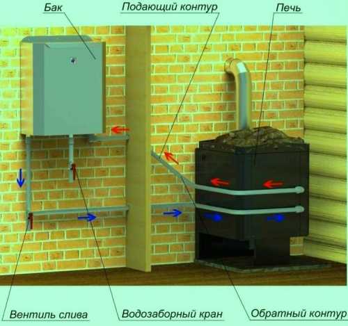 При сборке горизонтального котла для бани из трубы, ее кусок следует заглушить с одного конца, а на противоположном конце монтируется дверка. Вся конструкция составляет топку, в которую в процессе дальнейшего монтажа вваривается колено трубопровода отопления. Сверху над топкой монтируется металлический бак для воды. В процессе функционирования агрегата отопления происходит нагрев воды в колене и ее подъем в бак. По законам физики место поднимающейся разогретой воды занимает холодная. Прогрев всего объема воды происходит достаточно быстро и равномерно.
