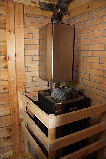 После сборки корпуса проводится монтаж отопительного устройства непосредственно в банном комплексе. После установки устройства проводится монтаж дымовой трубы. По окончании всех монтажных работ осуществляется укладка камней и монтаж теплового экрана из кирпича. При его монтаже следует помнить, что в нижней части следует сделать отверстия для осуществления циркуляции воздуха. Такая конструкция экрана позволит быстро и эффективно прогревать весь объем помещения банного комплекса.