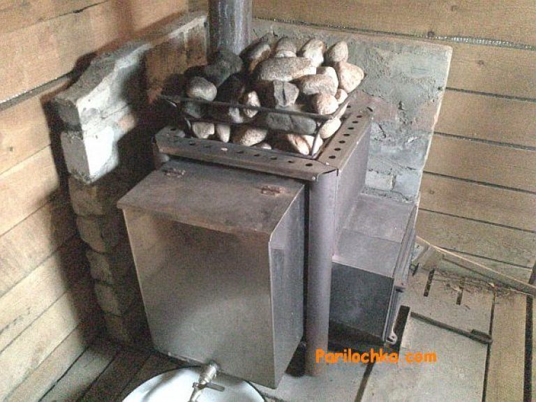 - нагревателя устанавливает корзина с камнями (для сауны) или закрытая каменка из металлического листа в 2–3 мм.
