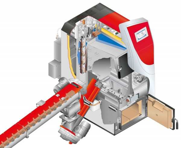 Внутри котлов отопление на гранулах забор древесного материала осуществляется специальными шнеками, которые перенаправляют его в топку.