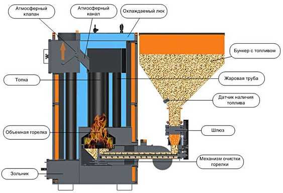 Нередко пеллетные котлы длительного горения имеют автоматизированную подачу топлива. Эта система включает в себя бункеры разного размеры, предназначенные для загрузки гранул. Далее, с помощью трубы небольшого сечения, их транспортируют в шнековую систему подачи топлива. Она осуществляет подачу пеллет в топку, где по ходу их сгорания выделяется много тепловой энергии. После этого нагретый воздух, перемешанный с раскаленными продуктами сгорания, двигается внутри теплообменника: таким образом осуществляется передача высвобожденного тепла в систему отопления.
