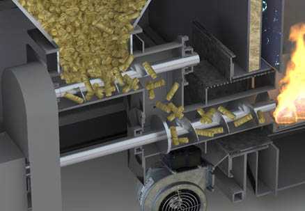 Подача пеллет в промышленный котел выполняется при помощи механической шнековой или пневмопередачи. Топливные гранулы засыпаются в отдельное помещение, соединенное транспортной линией с агрегатом. Посредством шнека или пневоустройства (червячной передачей), пеллеты забираются в помещении и направляются на горелку.