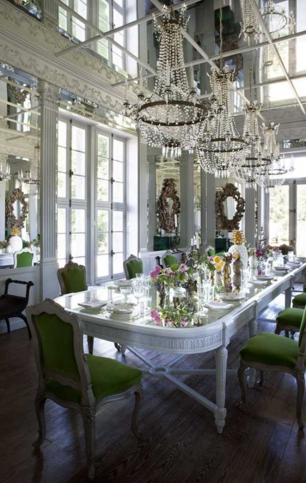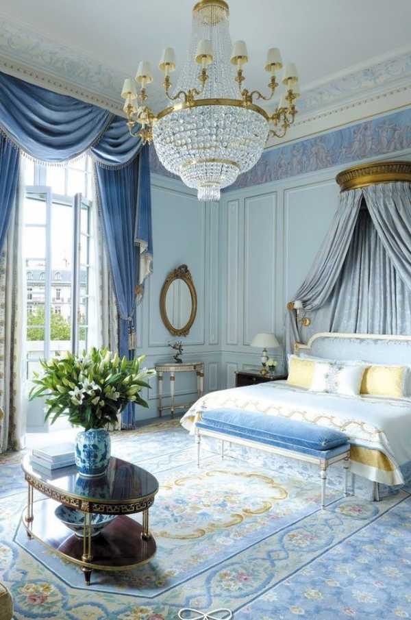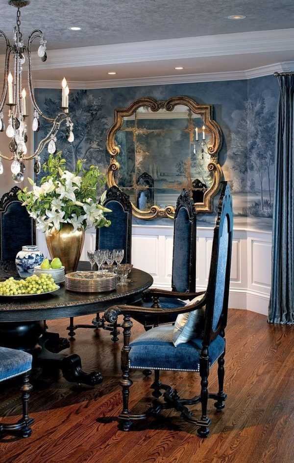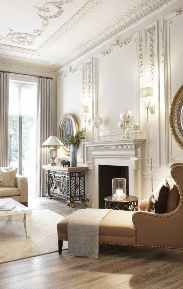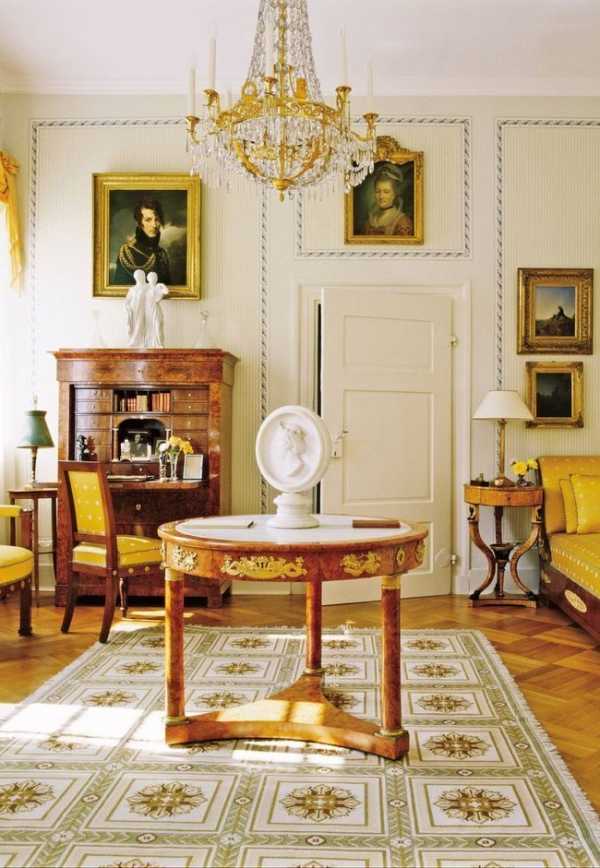 В «классике» важно выделить центр, например, красивая крупная люстра, помещенная в центр гипсового медальона. И уже от нее симметрично располагаются все архитектурные детали, мебель и элементы декора. Мебель – натуральное дерево, изогнутые резные ножки, золочение, бронзовые накладки, с обивкой из дорогих тканей. Стены можно украсить симметрично размещенными картинами в золоченных пышных рамах.