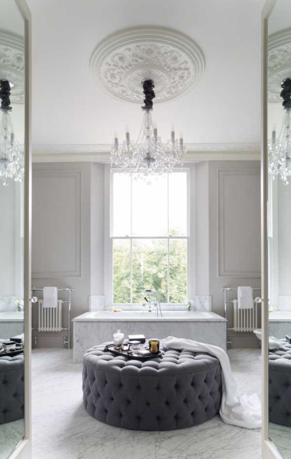 Люстра, помещенная в гипсовый медальон в ванной комнате