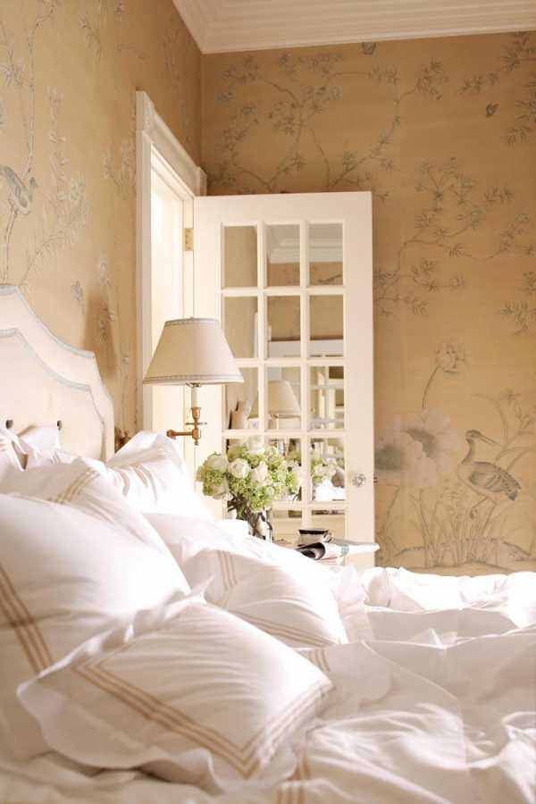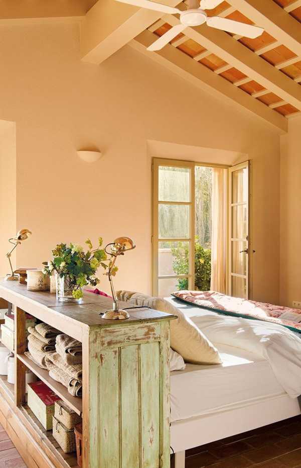 Состаренная тумба и стены нежно-персикового цвета в спальне