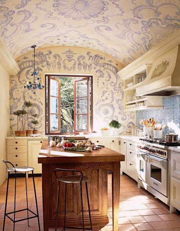 Плита – важнейшая часть сельского дома, поэтому она должна быть основательной, массивной, одной из главных составляющих кухонного интерьера. Посредине кухни – большой деревянный стол, на стульях для кухни – тканевые чехлы, подушечка под спину. На стенах – картины в простеньких рамочках: цветочные букеты, незамысловатые пейзажи, натюрморты.