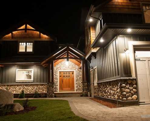 Фасад дома частично облицован камнем, что придает ему интересный облик. Для сочетания строения с участком в ландшафтном дизайне используются конструкции из такого же камня. Все это окружено ярко зеленым газоном, что придает общей картине свежести и натуральности.